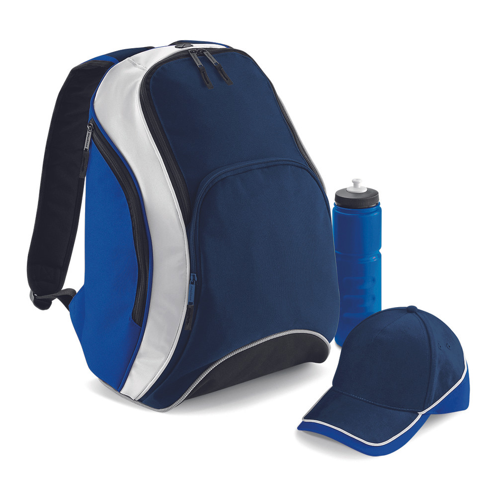 Etutasku vetoketjulla. Sivutaskut vetoketjulla. Sisäinen verkkotasku. Pehmustettu selkäosa. Säädettävät pehmustetut olkahihnat. Kantokahva. Korkean näkyvyyden heijastava reunus. Multimediatasku, jossa on rengas kuulokkeiden johtojen läpivientiä varten. Pulloteline.